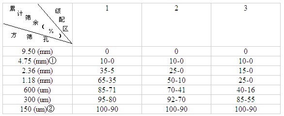 注①:砂的實(shí)際顆粒級(jí)配與表中所列數(shù)字相比,除4.75mm 和600μm 篩檔外,可以略有超出,但超出總量應(yīng)小于5%。 |